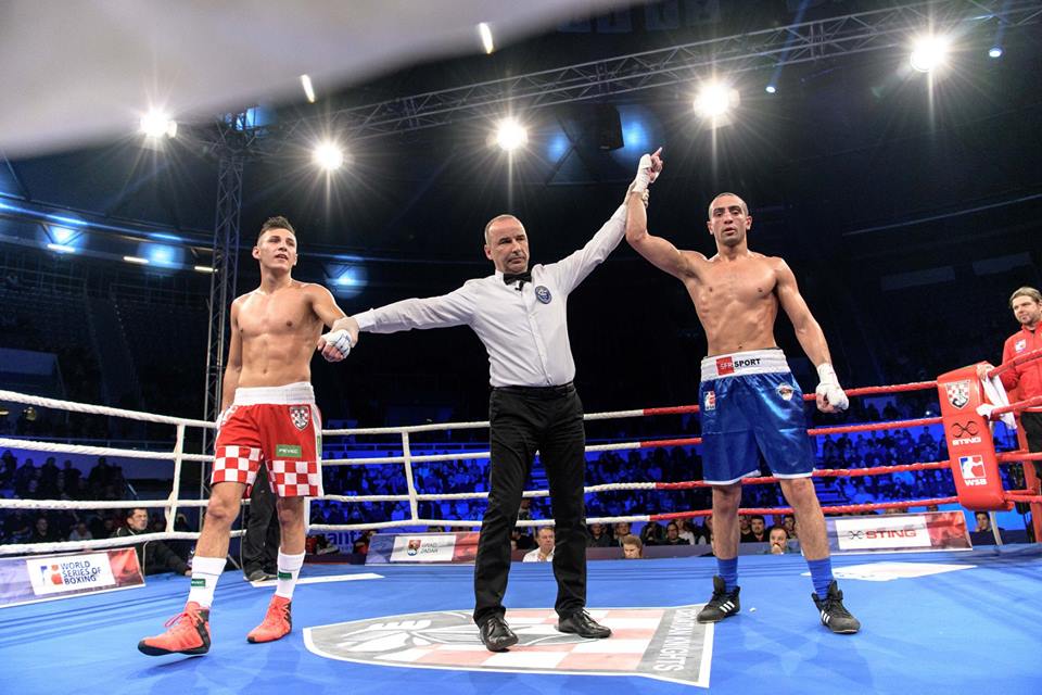 – Nizar Trimech (photos ci-dessous), disputait un combat au sein de la « France Fighting Roosters », franchise montée par Brahim Asloum. Il s’est imposé à Zadar, en Croatie, face au boxeur local Aleksa Markovic en 75 kgs, dans le cadre des World Series of Boxing.