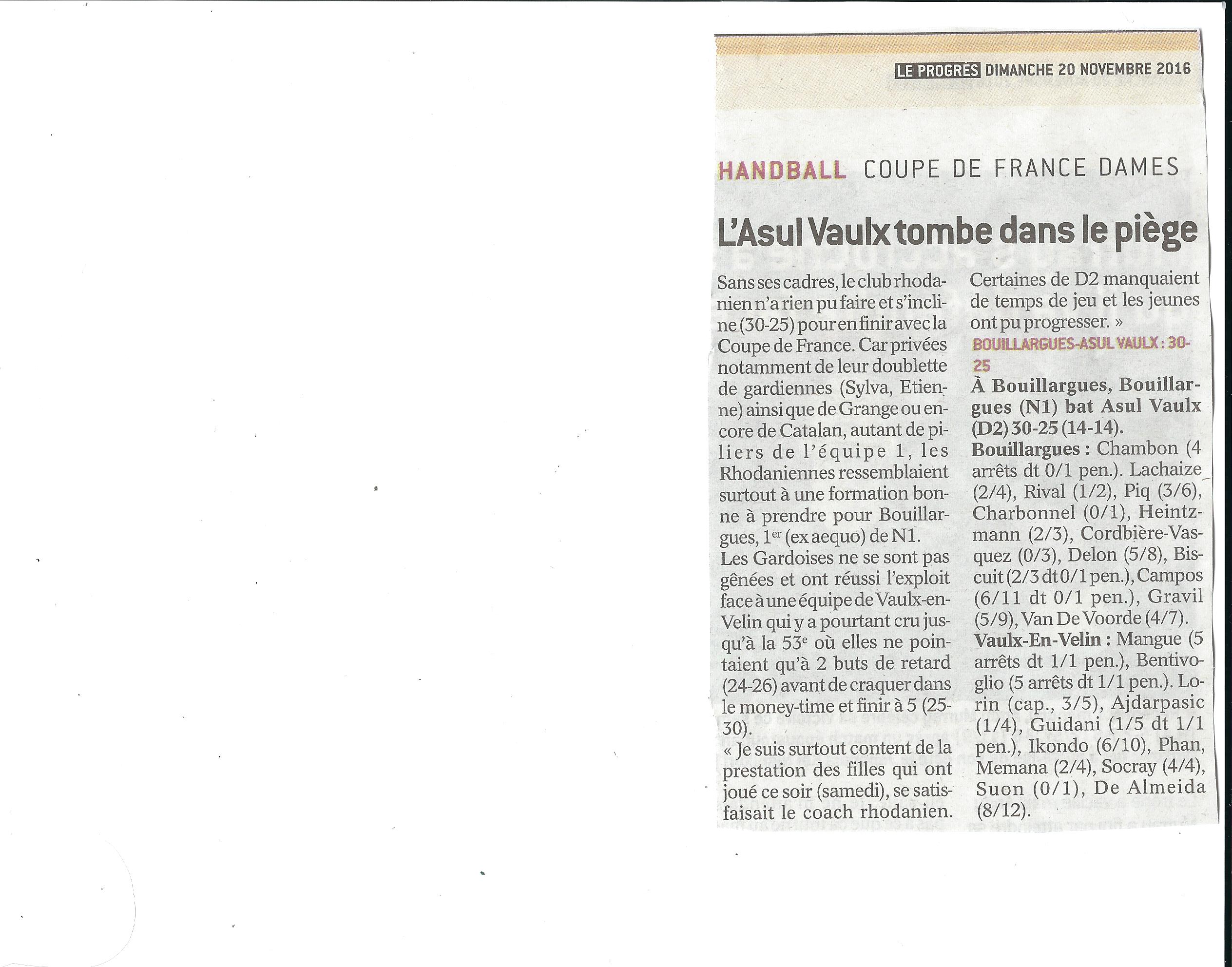 Skip to contentHandball COUPE DE FRANCE DAMES « L’Asul Vaulx tombe dans le piège » – Le Progrès – 20/11/2016
