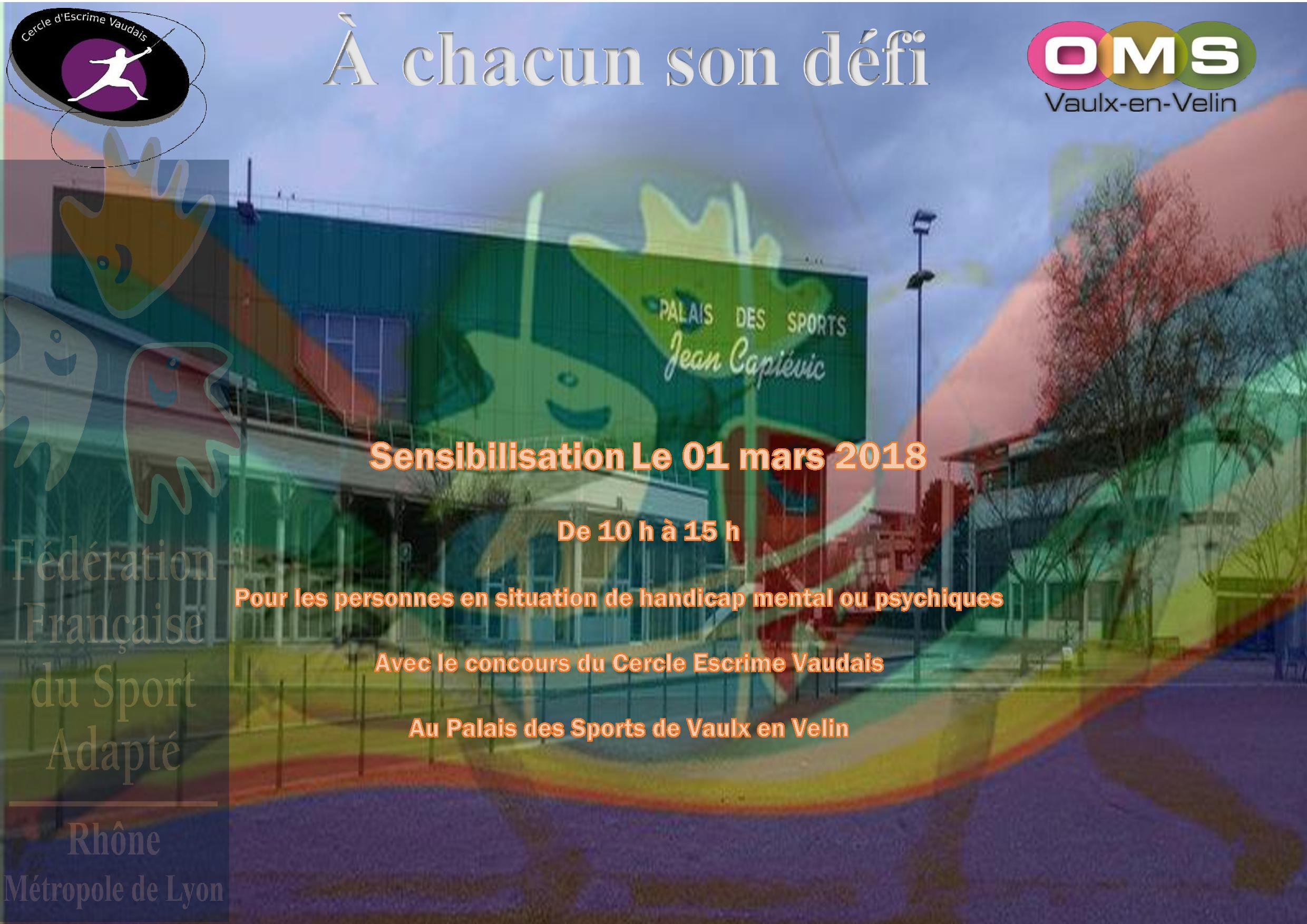 Une opération » A chacun son défi » organisée par le Cercle d’Escrime Vaudais (CEV) en collaboration avec le Comité Départemental du Sport Adapté (CDSA) représenté par son président Jean-Paul Moncoudiol et sa conseillère technique Pauline Occelli-Rochas.