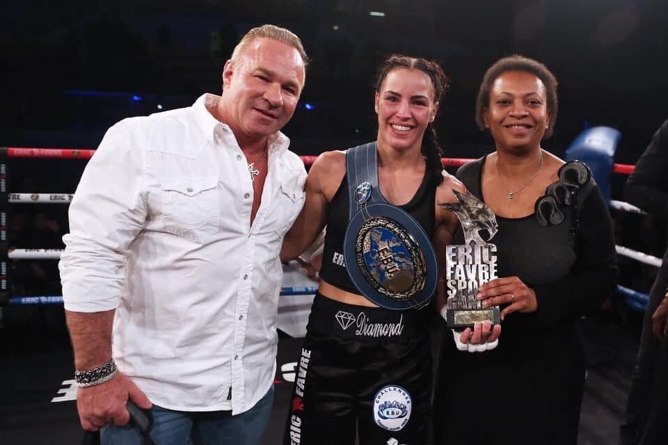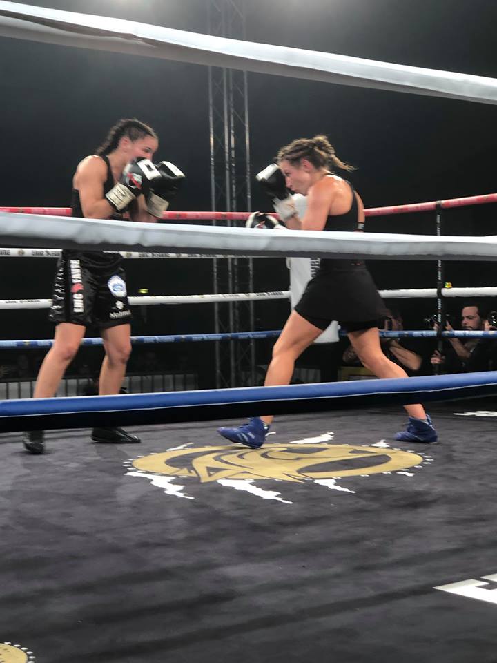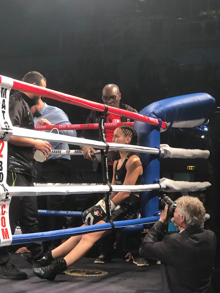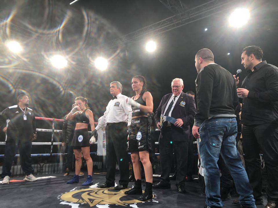 La vaudaise, déjà championne de France l’a emporté pour son 11° combat pro, par arrêt de l’arbitre à la 9° reprise, devant un public tout acquis à sa cause.