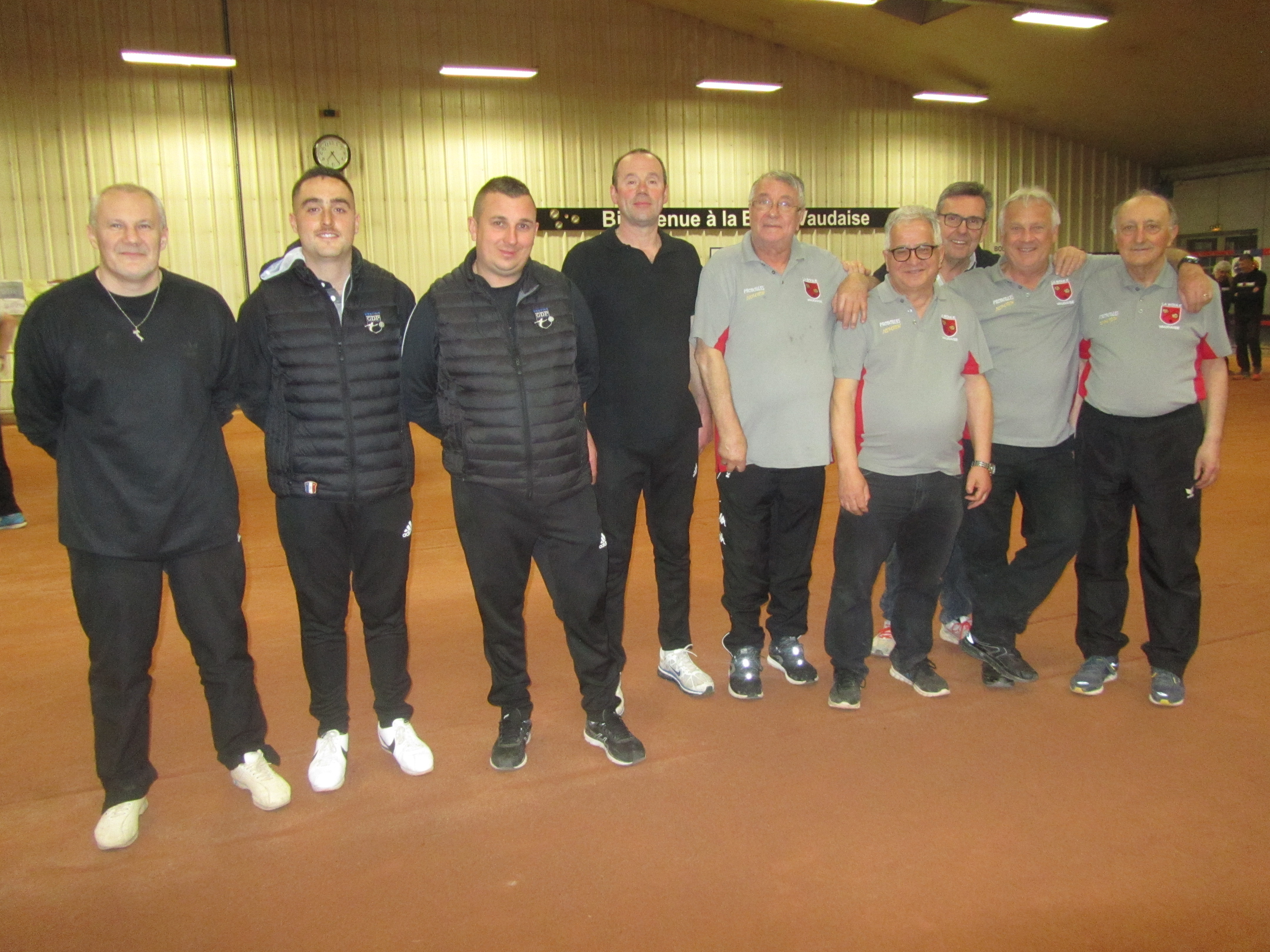 PHOTO ci-dessous : en sombre ASBM (Accasto, Di Jorio, Bousch, Jan) & en gris La Vaudaise-ALBEU (Jeune, Perrozzi, Dunière, Peyratou, Scappat).