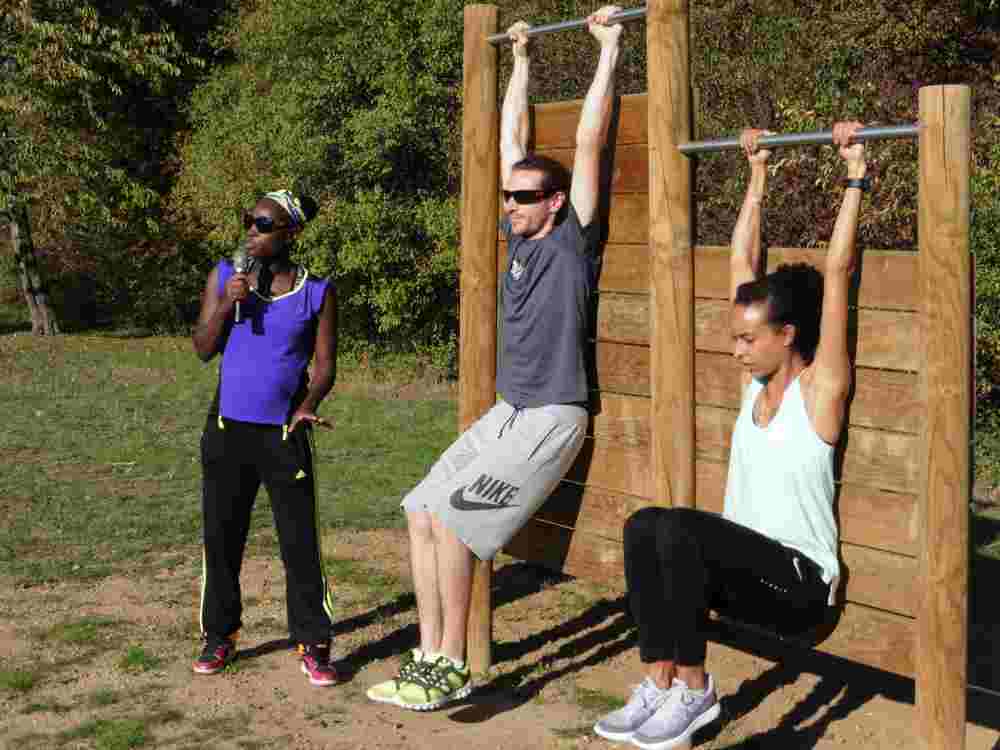 Sena Kinhouande, présidente du club de Vaulx en Velin Athlétisme a dirigé la séance collective d’échauffements et d’exercices en présence de nombreux habitants, adultes et enfants du quartier.
