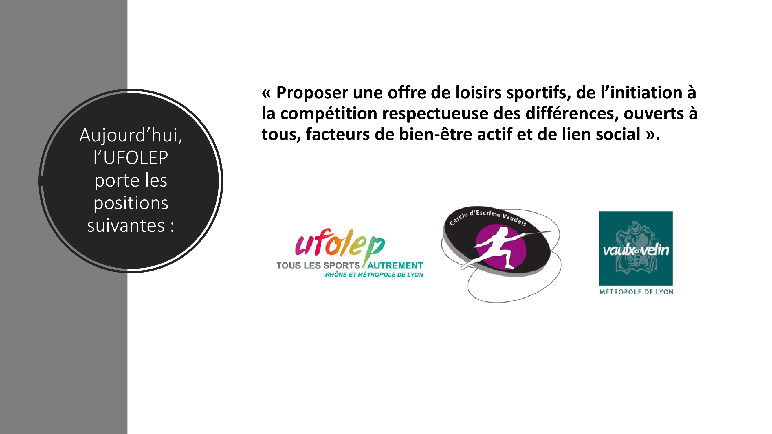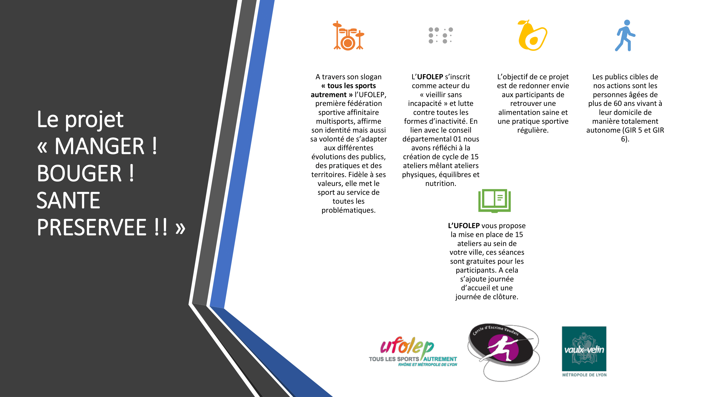 A partir du 15 novembre, le cercle d’escrime vaudais, en partenariat avec l’Union française des œuvres laïques d’éducation physique (Ufolep), organisera différents ateliers gratuits jusqu’au 6 mars 2020. Intitulés « Manger, bouger, santé préservée ! », ces ateliers ont pour objectifs de promouvoir notamment une activité physique conjuguée à une alimentation saine. Pour y participer ou obtenir des informations, il est demandé de contacter Hervé Jacquet, directeur technique par mail : directeurtechnique@escrime-vaulx.fr ou par tel : 06.66.58.04.85